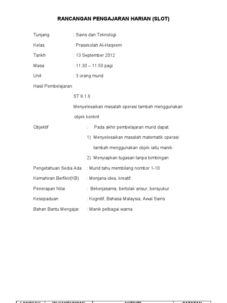 RANCANGAN PENGAJARAN HARIAN. Up to 24 cash back Nov 07 2013 Rancangan Pengajaran Slot Kelas. Contoh Rph Prasekolah - Rancangan Pengajaran Slot Matematik Awal Otosection.